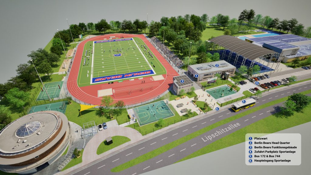 An der Lipschitzallee 29, 12351 Berlin befindet sich die Heimat der Berlin Bears – ein Ort, an dem Teamgeist, Bewegung und Begeisterung für American Football zusammenkommen. Der dargestellte Lageplan der Sportanlage bietet einen Überblick über das heutige Vereinsgelände und zeigt gleichzeitig, wohin sich unser Verein in den kommenden Jahren entwickeln möchte.