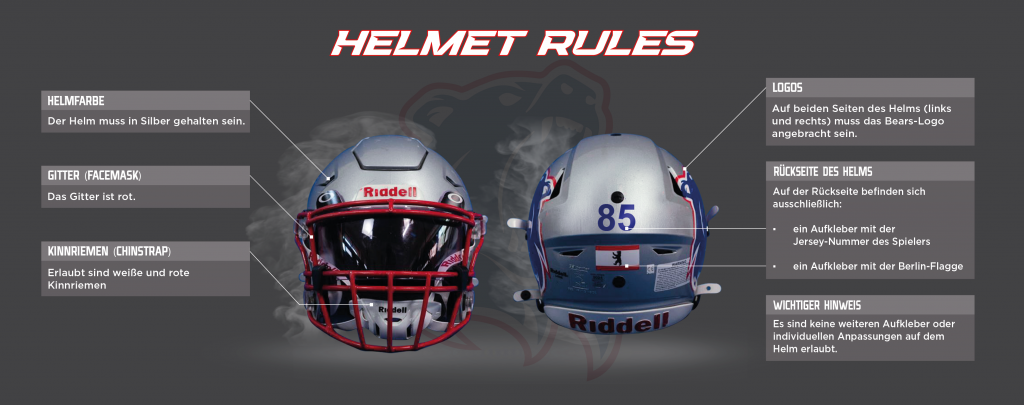 Unsere Helmet & Uniform Rules sind weit mehr als reine Kleidervorschriften. Sie spiegeln unsere Identität als Team wider und zeigen, wofür die Berlin Bears stehen: Respekt, Professionalität und Stolz. Wenn wir einheitlich auftreten, senden wir eine klare Botschaft – an Gegner, Fans, Sponsoren und an uns selbst. Wir treten als eine Einheit auf, nicht als Einzelpersonen.